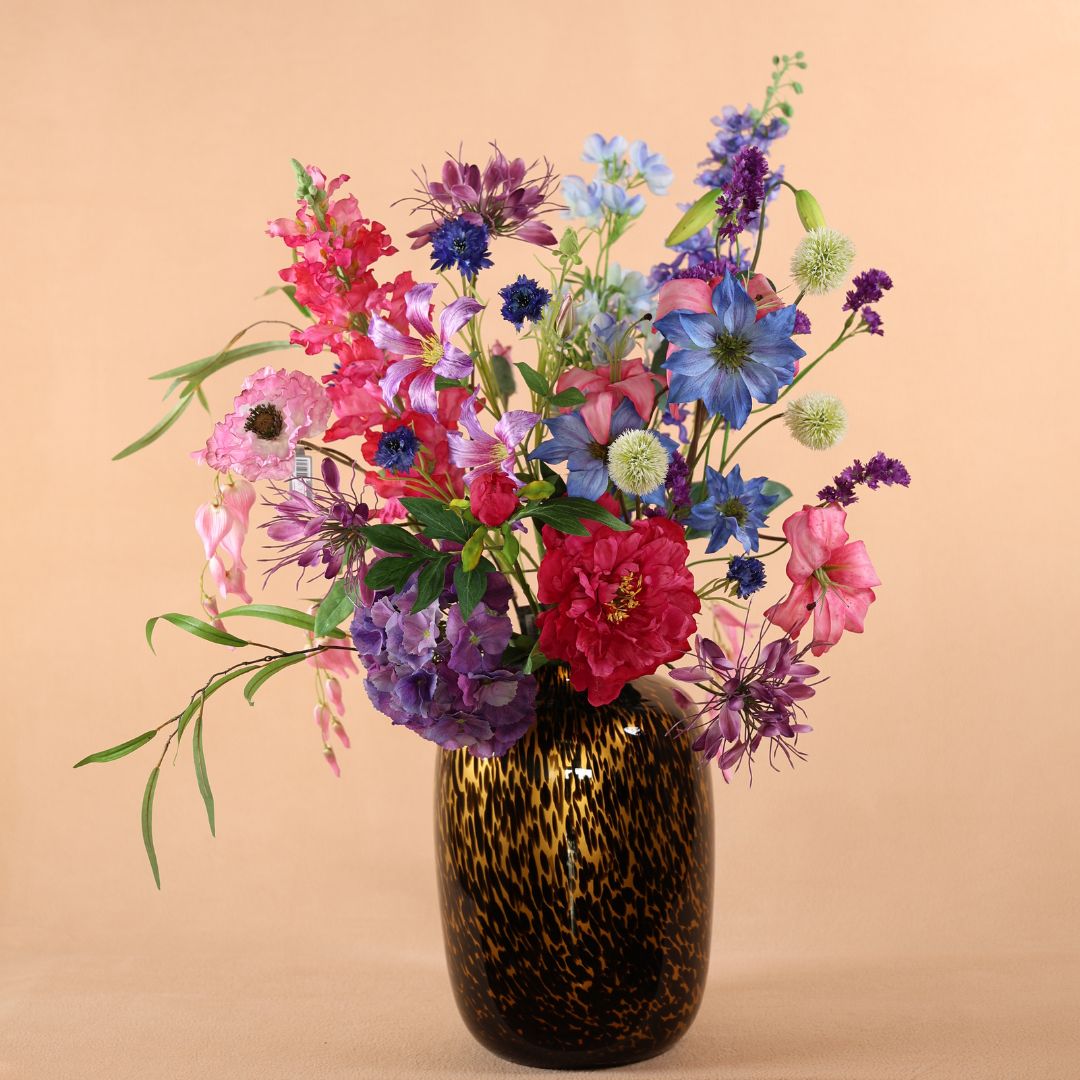 Plaats dit boeket in een lazen vaas in een gouden tint om het kleurenspel extra te laten spreken. Combineer met velvet stoffen, gouden accenten voor een warme uitstraling.