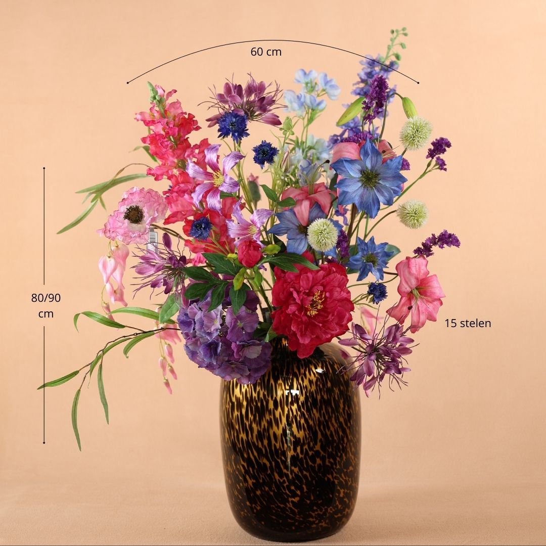 Met een hoogte van ca. 90 cm en een breedte van ca. 70 cm is Paradise Royaal perfect geschikt voor grotere ruimtes, zoals een eettafel, zuil of ontvangstruimte. Dankzij de hoogwaardige zijden bloemen en het vakmanschap waarmee het boeket is samengesteld, straalt het niet alleen klasse uit, maar blijft het ook jarenlang mooi – zonder enig onderhoud.