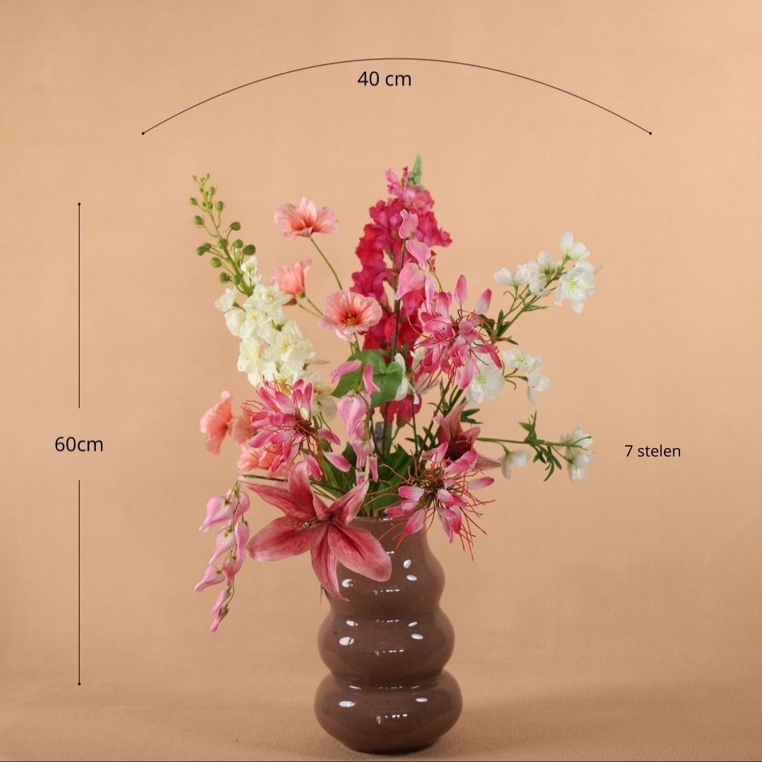 Met een hoogte van ca. 60 cm en een breedte van ca. 40 cm is Petit Jolie ideaal voor op een dressoir, sidetable, eettafel of nachtkastje. De zijden bloemen zijn met de hand geschikt en van hoogwaardige kwaliteit — ze ogen levensecht, behouden hun vorm en hebben geen verzorging nodig.