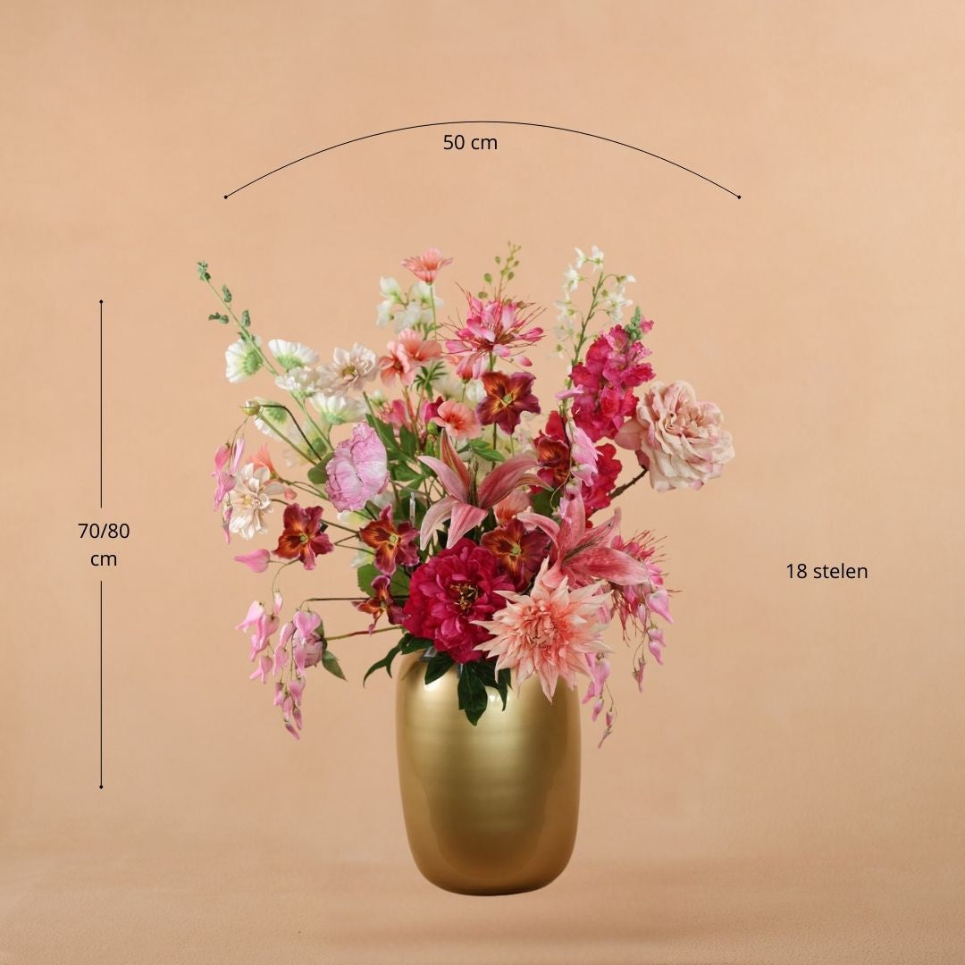 Het boeket is ca. 70 tot 80 cm hoog en 50 cm breed, en bestaat uit hoogwaardige zijden bloemen die zorgvuldig met de hand zijn geschikt. Dankzij de realistische afwerking en verfijnde kleuren is Royaal Jolie nauwelijks van een echt boeket te onderscheiden – maar dan zonder verwelking of verzorging.