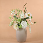 Het zijden bloem boeket is zorgvuldig samengesteld in wit- en groentinten, wat zorgt voor een frisse en harmonieuze uitstraling. De bloemen zijn nauwelijks van echt te onderscheiden en blijven het hele jaar door mooi, zonder water of onderhoud. Ideaal voor wie houdt van een stijlvolle look met maximaal gemak.