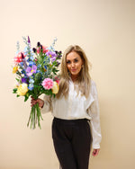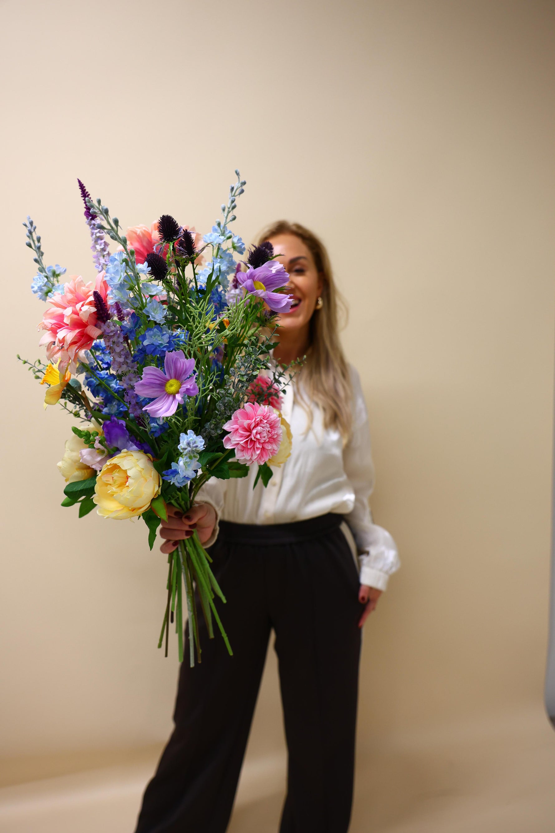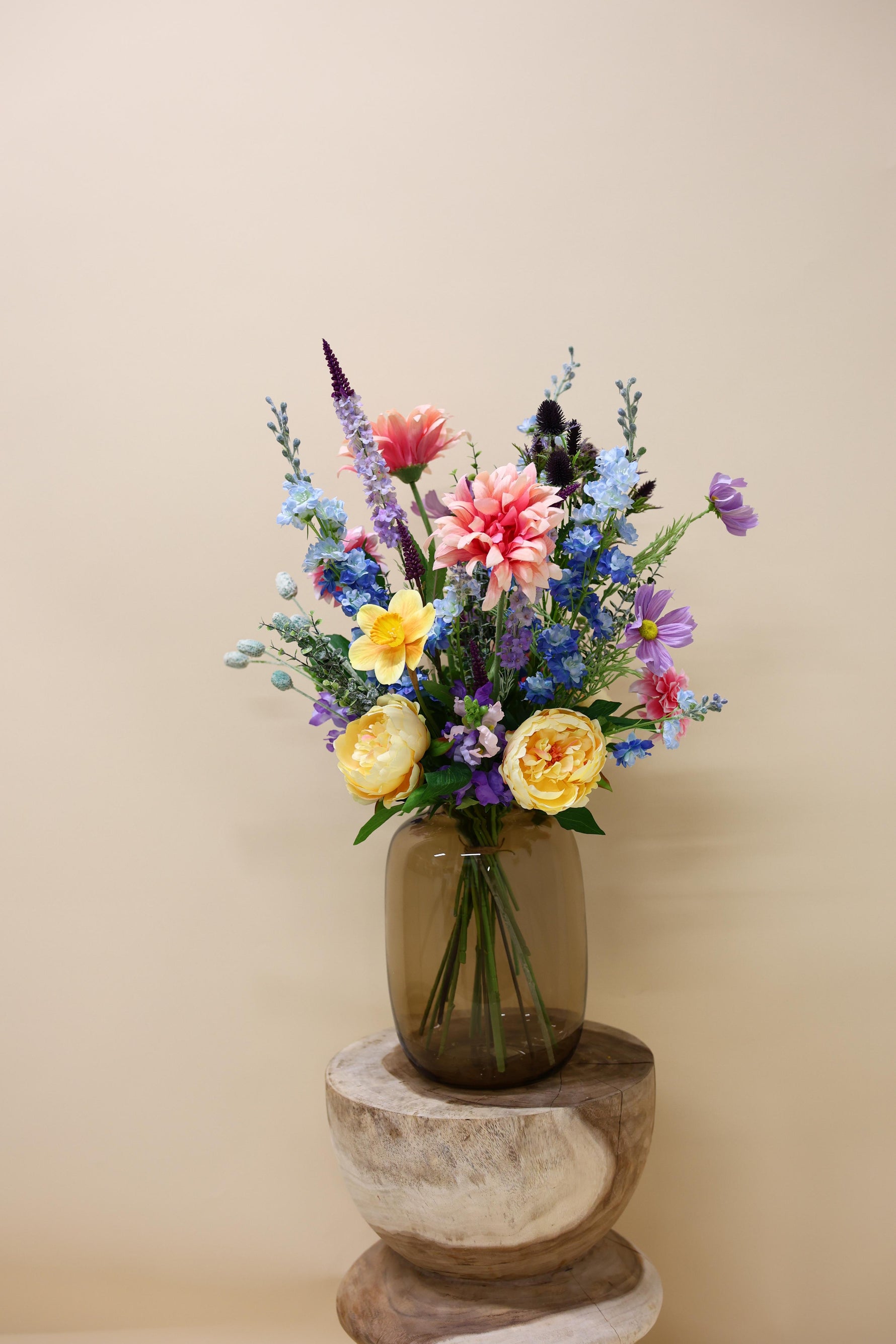 Een sprankelend zijden boeket vol vrolijke kleuren die direct het lentegevoel in huis halen. Dit luxe bloemstuk combineert delphinium, pioenrozen, distels, narcissen en dahlia’s tot een echte eyecatcher. Perfect als cadeau of als kleurrijk statement in je interieur. Dankzij de hoogwaardige zijden bloemen geniet je jarenlang van deze frisse uitstraling zonder onderhoud.