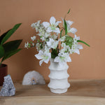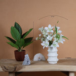 Eenheid prijs / PerMinimalistisch, stijlvol en tijdloos. Dit witte zijden boeket straalt pure rust en luxe uit. De combinatie van zachte witte bloemen en subtiele groentinten maakt dit boeket perfect voor een clean en verfijnd interieur.